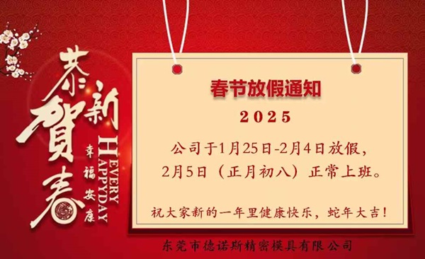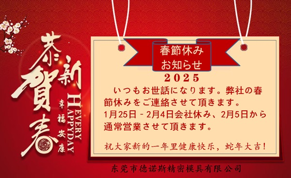 トピックス 2025.01.202024.12.22 2025年 春節(連休)のご案内 トピックス 中国本社は1月25日から2月4日の間お休みをいただきます。日本営業は通常通り営業致します。見積りのご依頼、製作可否などのご相談も通常通り承ります。